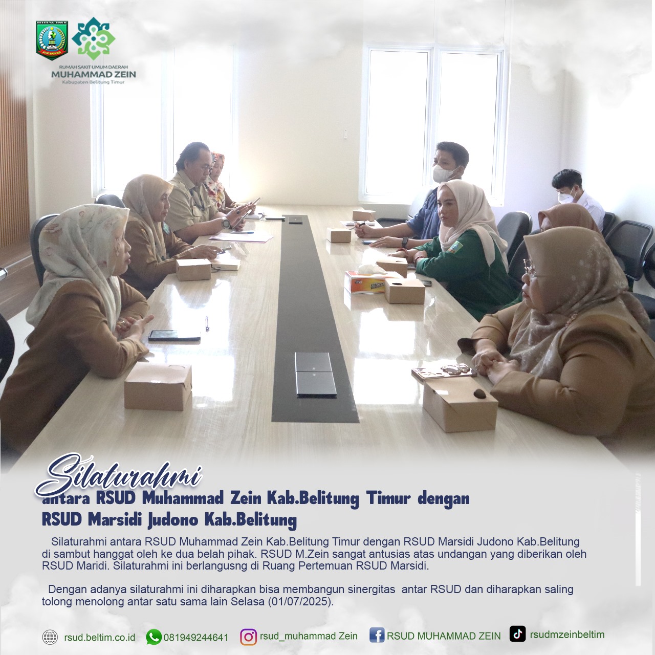 BELITUNG - Silaturahmi antara RSUD Muhammad Zein Kabupaten Belitung Timur dengan RSUD Marsidi Judono Kabupaten Belitung di sambut hanggat oleh ke dua belah pihak. Direktur RSUD M.Zein yaitu dr. Vonny Primasari, MARS. sangat antusias atas undangan yang diberikan oleh Direktur RSUD Maridi yaitu Ibu dr. Ratih Lestari Utami. Silaturahmi ini berlangusng di Ruang Pertemuan RSUD Marsidi, Selasa, (01/07/2025).